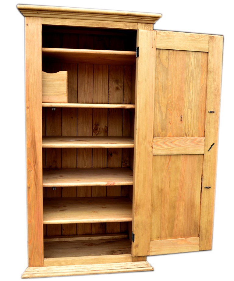 Однодверный шкаф. 5 полок. Из них 3 регулируемые по высоте. 1 деревянный ящик для щеток и крема. Массив сосны, старение. Кованная ручка.