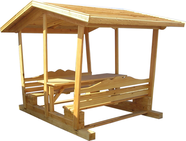 В комплектность беседки входит: черновая крыша (обрешетка), скамейки, стол.