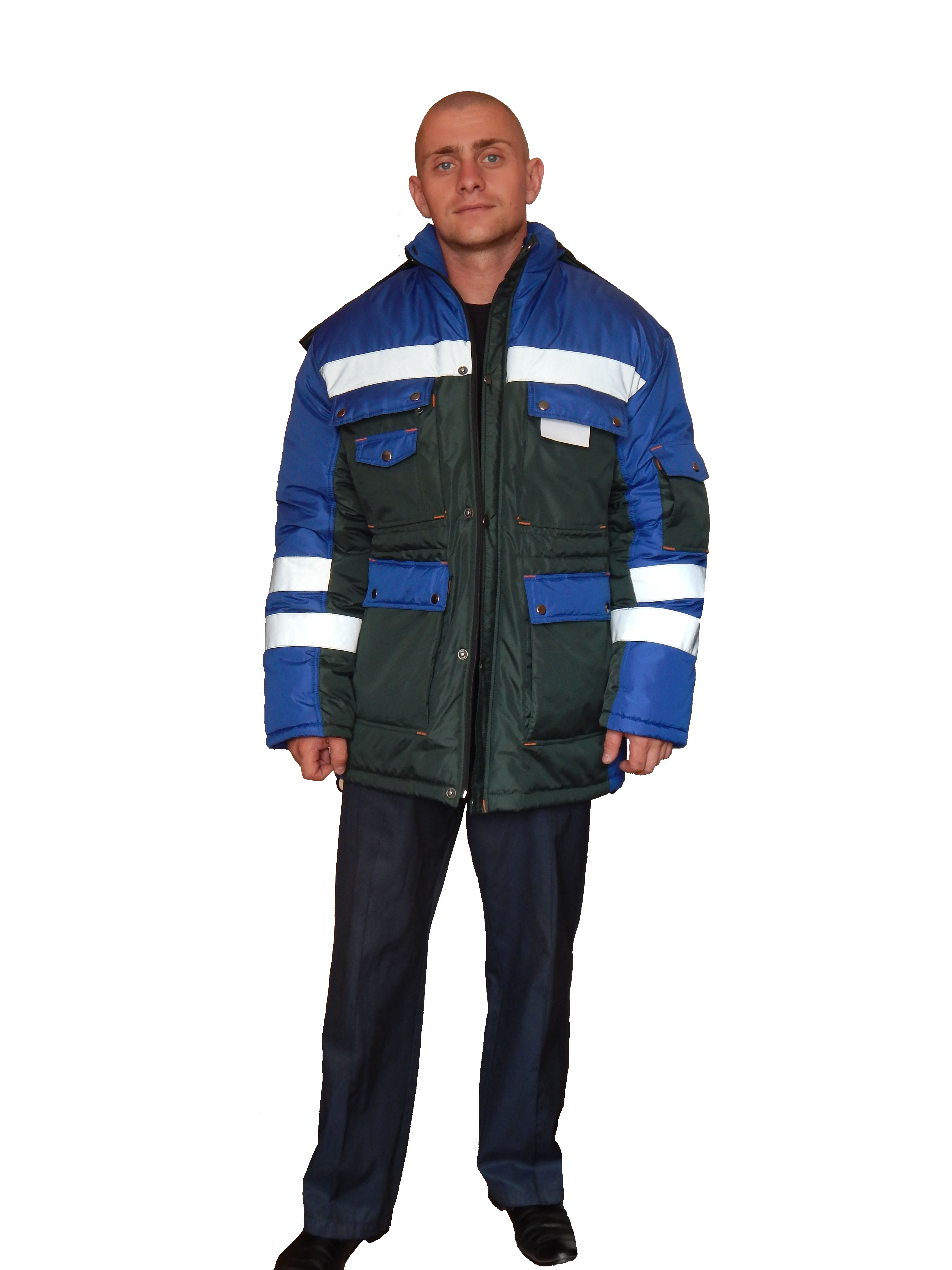 Куртка мужская Тн. Модель К 070.16. СТБ 1387-2003. Материалы: ткань «ДЮСПА» п/э 100%; утеплитель- полотно нетканое объемное (синтепон) 200 г/м2 - 2 слоя. С центральной бортовой застежкой-молнией, отрезная планка, застегивающаяся на кнопки. Нагрудные накладные полуобъемные карманы с клапанами, застегивающимися на кнопки. На правом нагрудном кармане настрочен маленький накладной карман с фигурным клапаном. Боковые полуобъёмные двойные накладные карманы с клапанами, застегивающимися на кнопки. Рукава втачные, на левом рукаве настрочен накладной полуобъемный карман с фигурным клапаном. Воротник стойка. Спинка и перед с отрезными кокетками и боковыми рельефами. По линии талии - кулиска. Капюшон пристегивается застежкой-молнией. СВО настрочено на кокетки переда, спинки и по низу рукавов. Внутренний прорезной карман, застегивающийся на кнопку. Возможно изготовление по эскизам заказчика.